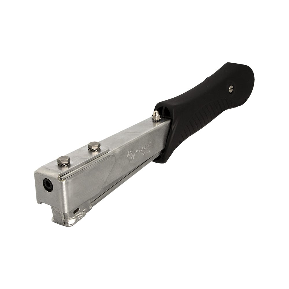 Механический ударный степлер КОБАЛЬТ скобы 6-10 мм, тип 140, обрезиненная рукоятка 790-410 срабатывает при ударе о деталь. Это исключает напряжение ладони и запястья, не приводит к усталости при длительных обивочных работах