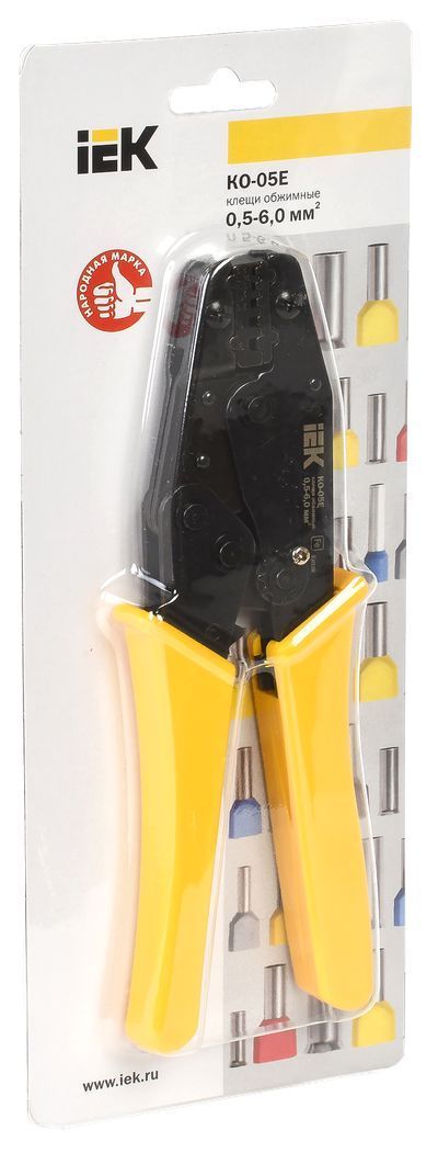 Клещи обжимные КО-05Е предназначены для опрессовки основных видов и типоразмеров наконечников, таких как гильз Е-типа, НГИ-2, НГ сечением от 0,5 до 6,0 мм2. Губки клещей типа КО-05Е промаркированы значением сечения, используемого наконечника или разъема. Клещи, изготовленные из 3-мм закаленной стали, имеют храповой механизм, а также оборудованы специальным приспособлением, позволяющим разблокировать их из любого положения.