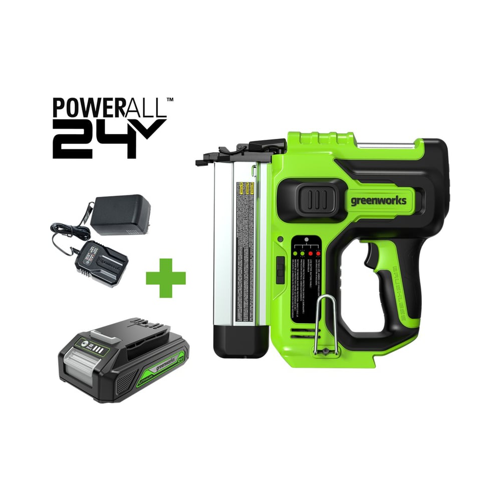 Аккумуляторный нейлер GD24BN создан для максимально удобной работы без проводов и шлангов по скреплению разнообразных деревянных материалов (паркетная доска, фанера, ДСП, ДВП, плинтус, наличники и тп.), полимеров, плотного гофрокартона и т.д. В качестве оснастки используются гвозди из гальванизированной проволоки, тип 18GA, длиной 19-50,8мм и сечением 1,25х1,05мм Построен на основе мощного и надёжного бесщёточного двигателя DigiPro™, который эффективно использует энергию аккумулятора и не теряет мощность под нагрузкой Greenworks Intelligent Power – инновационная цифровая система управляет и контролирует батарею, инструмент и зарядное устройство для максимальной производительности и долгого срока службы Нейлер имеет встроенный индикатор состояния, который сигнализирует о застревании/ отсутствии гвоздя, перегреве и тд. Инструмент работает в 2 режимах: одиночный удар/ скоростной удар Одиночный удар обеспечивает максимально точное скрепление деталей без следов монтажа Скоростной удар обеспечивает высокую скорость скрепления материалов при монтаже кровельной пароизоляции или мембраны Бесключевой регулятор позволяет настроить глубину забивания гвоздя в зависимости от твёрдости скрепляемых материалов Упорный носик имеет защитную накладку, чтобы не оставлять следов на монтируемых деталях Нейлер комплектуется переставляемой поясной клипсой Эргономичный корпус инструмента имеет нескользящее покрытие в зонах хвата Яркая LED-подсветка рабочей зоны