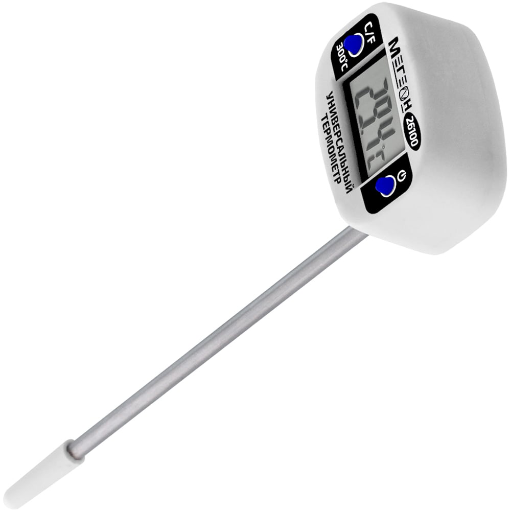 МЕГЕОН 26100 - новинка в модельном ряду цифровых термометров для промышленных и бытовых нужд. Представленная модель предназначена для замеров температуры с высокой точностью контактным методом в диапазоне -50 ... 300°C. Помимо этого изделие имеет вторую единицу измерения- Фаренгейты. Отличительной особенностью является возможность поворота экрана на 180°. Ручная установка единиц измерения и функция автоматического выключения при длительном простое, делают прибор более удобным в обращении. Зонд термометра изготовленный из нержавеющей стали, позволяет применять измеритель в отраслях связанных непосредственно с пищевыми продуктами, с нефтехимическими составами, с агрессивными жидкостями и материалами. Эргономичный дизайн и компактные размеры в полной мере смогут оценить профессионалы и любители.