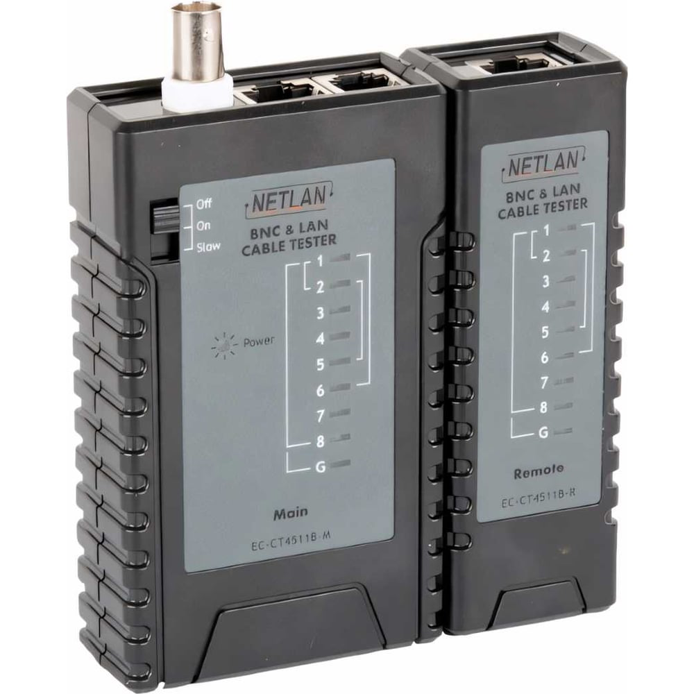 Кабельный тестер NETLAN RJ45, RJ12, RJ11, BNC EC-CT4511B служит для тестирования кабельной сети на правильность разводки и целостности кабельной линии в полевых условиях. Прибор работает с коаксиальными кабелями, оконцованными BNC разъемами, LAN кабелями с разъемами RJ45 и телефонными кабелями с разъёмами RJ11. При помощи тестера можно обнаружить такие ошибки в линии, как нарушение схемы разводки проводников, обрыв проводников и короткие замыкания.