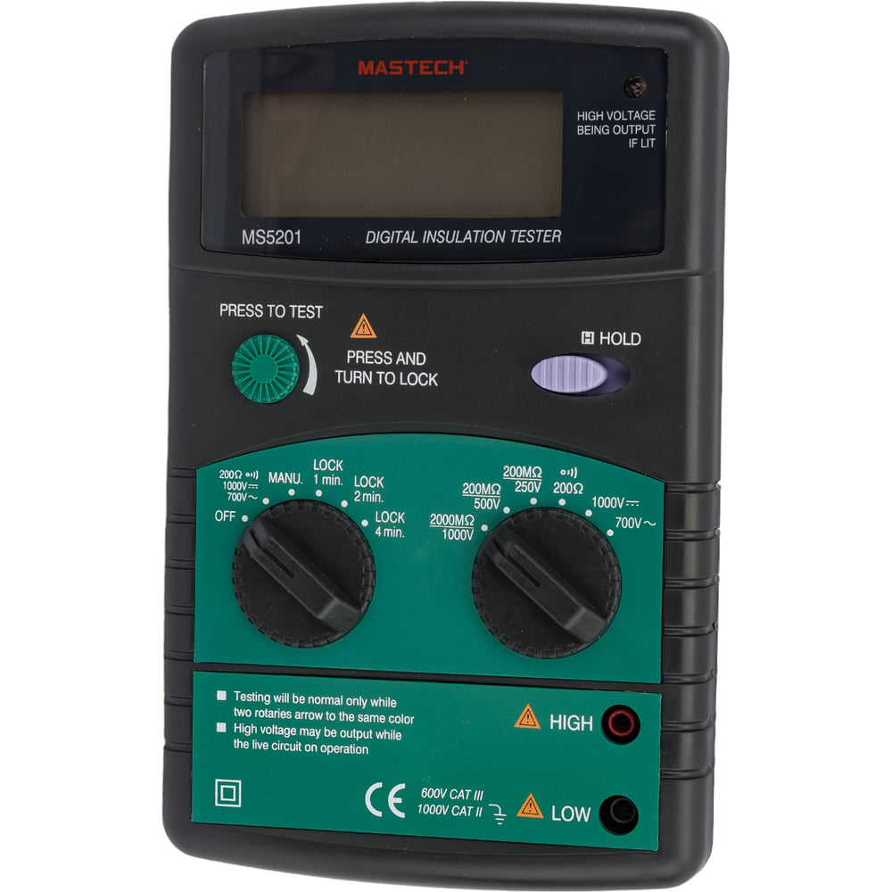 Цифровой мегаомметр Mastech MS5201 59271 помогает измерять сопротивление, постоянное/переменное напряжение и ток короткого замыкания. Благодаря функции DATA HOLD можно удерживать только что полученные данные на дисплее. Имеется режим "прозвонка". Модель питается от 6 батареек 1.5 В типа АА. Прибор поставляется в пластиковом кейсе, в котором его удобно хранить и транспортировать.