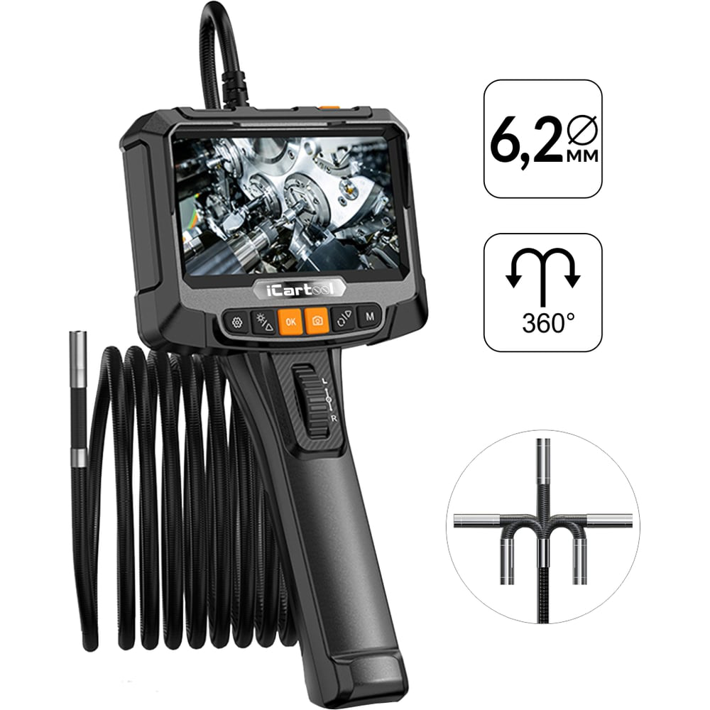 iCartool IC-VC8052W управляемый видеоэндоскоп с поворотной камерой на 360° и цветным дисплеем диагональю 5”. Экран с IPS матрицей имеет удобный интерфейс и воспроизводит изображения в качестве HD. Камера разрешением 2 Мп с широким углом обзора 70° обеспечивают качественную картинку, а цифровой зум помогает рассмотреть мелкие детали. Тип зонда – полужесткий, длиной 1 м и диаметром 6,2 мм. Внешняя оболочка дистальной части усилена вольфрамом для увеличения срока эксплуатации. Зонд прибора имеет встроенный термодатчик, он отключает прибор при достижении температуры 80 °C во избежание перегрева головки камеры. Для работы в темных местах предусмотрена регулируемая LED подсветка. Эндоскоп работает от собственного аккумулятора до 3х часов. Видеоэндоскоп позволяет производить аудиозапись во время съемки, а также доступно воспроизведение видеозаписи со звуком. Технические характеристики: Тип дисплея: IPS, LCD Артикуляция: 1 плоскость (2 направления) Тип камеры: CMOS Разрешение камеры: 2 Мп Жесткость зонда: полужесткий Материал оплетки трубки зонда: полиуретан Материал оплетки дистальной (подвижной) части: вольфрам Разрешение изображения: 1920 х 1080 Формат изображения: JPEG Разрешение видео: 1280 × 720 Формат видео: AVI TF карта памяти: 32 Гб class 10 Цифровой зум: Да Аудиозапись съемки: Да Таймер отключения: Да Термодатчик: Да