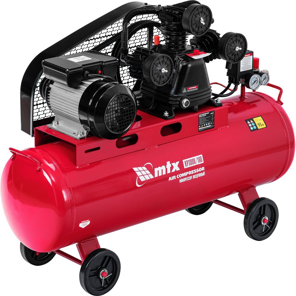 Компрессор воздушный МТХ КР3000/100 58023 с ременным приводом от электродвигателя, мощностью 3,0 кВт и производительностью 510 л/мин, с ресивером объемом 100 литров, применяется для подачи сжатого атмосферного воздуха к пневматическому инструменту. К нему можно подключить гайковерт, дрель, углошлифовальную машину, степлер, краскопульт, продувочный пистолет или другой пневмоинструмент. Для подключения предусмотрены 2 штуцера: быстросъемный и «елочка». Компрессор подходит для профессионального использования на предприятии автосервиса, строительной площадке, в мастерской.