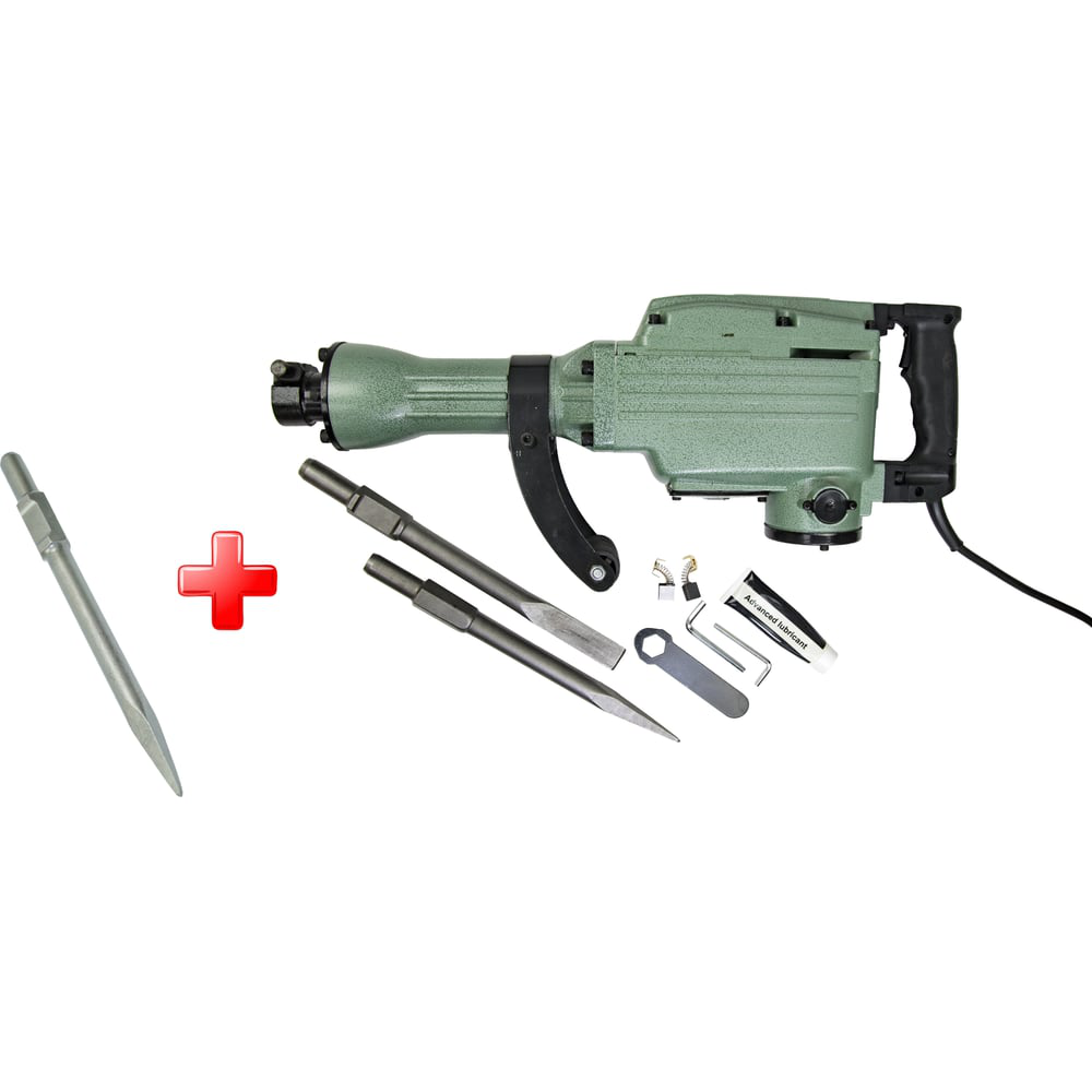 Отбойный молоток - ударно-механический инструмент для разрушения твердых материалов. Обладает однофазным высокомощным электродвигателем (1.65 кВт), подключается к розетке четырехметровым кабелем. Для фиксации двигающейся от импульса пики используется шестигранный патрон.