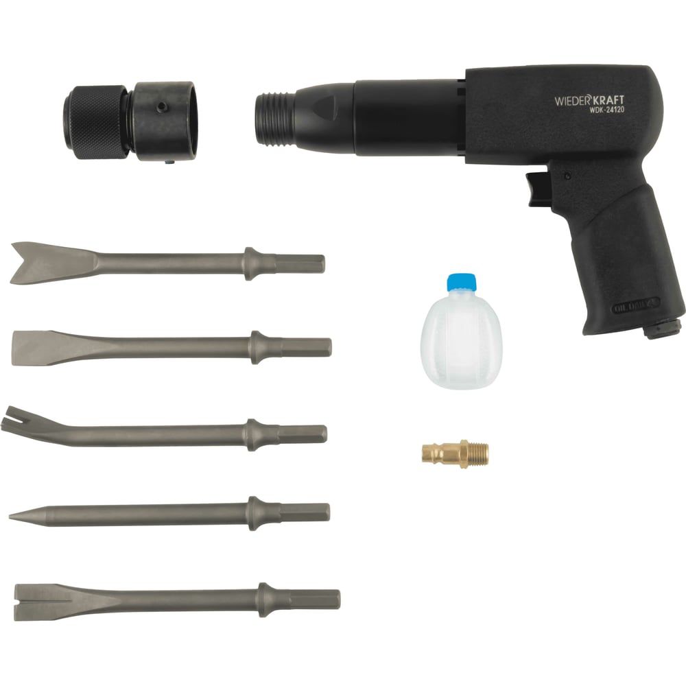 Пневматический молоток WIEDERKRAFT 2500 уд/мин, HEX 175 мм WDK-24120 поставляется в алюминиевом корпусе в комплекте с набором высокопрочных зубил из хромомолибденовой стали, съемным патроном, быстросъемным соединением 1/4" и пневматическим маслом.Предназначен для различных ударных и режущих работ: кузовных авторемонтных, зачистки сварочных швов, отбивания заклёпок, резки листовой стали, обработки камня, бетона.Класс инструмента HEAVY DUTY.