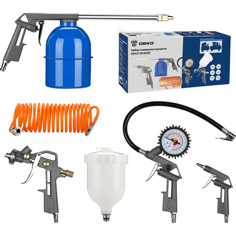 Набор пневмоинструмента DEKO DKSG05 предназначен для лакокрасочных работ, продувки загрязненных поверхностей сжатым воздухом, подкачки шин, нагнетания технических растворов и вязких жидкостей. Корпуса изготовлены из металла, что позволяет добиться высокой надежности и длительного срока службы. Также стоит отметить большой рабочий ресурс и возможность длительной работы без остановки. Продувочный пистолет: Рабочее давление: 2-8 атм Расход воздуха: 400 л/мин Соединение: Байонетная гайка (тип 47А)/Быстросъемное (тип 113) Моющий пистолет: Рабочее давление: 2-4 атм Расход воздуха: 200-400 л/мин Соединение: Байонетная гайка/Быстросъемное Пистолет для подкачки шин: Максимальное давление: 8 атм Соединение: Байонетная гайка/Быстросъемное Шланг воздушный спиральный: Максимальное давление: 10 атм Длина: 5 м Диаметр: 5 мм (внутренний), 8 мм (внешний) Температурный режим:-40 - +90 гр.ц. Соединение: Байонетная гайка/Быстросъемное