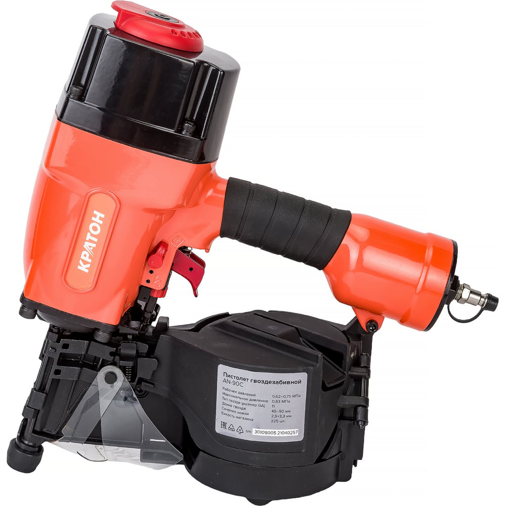 Мощный барабанный пистоле КРАТОН AN-90C для забивания гвоздей до 90 мм. Большая глубина забивания. Для работы с максимально толстыми материалами.Преимущества:- Огромная пробивная мощность для работы с самыми толстыми материалами- Предохранитель от случайного нажатия обеспечивает безопасную работу- Удобная эргономичная ручкаТехнические параметры :Расход воздуха, л/мин 2,0Сечение ножки, мм 2,5-3,3Длина гвоздя, мм 45-90Давление, бар 5,5-8Ёмкость магазина, шт. 225 - 300Расход воздуха, л/выстрел 2Длина товара, мм 14.6Ширина товара, мм 37.7Высота товара, мм 34.5Масса нетто, кг 4.3Масса брутто, кг 5.7