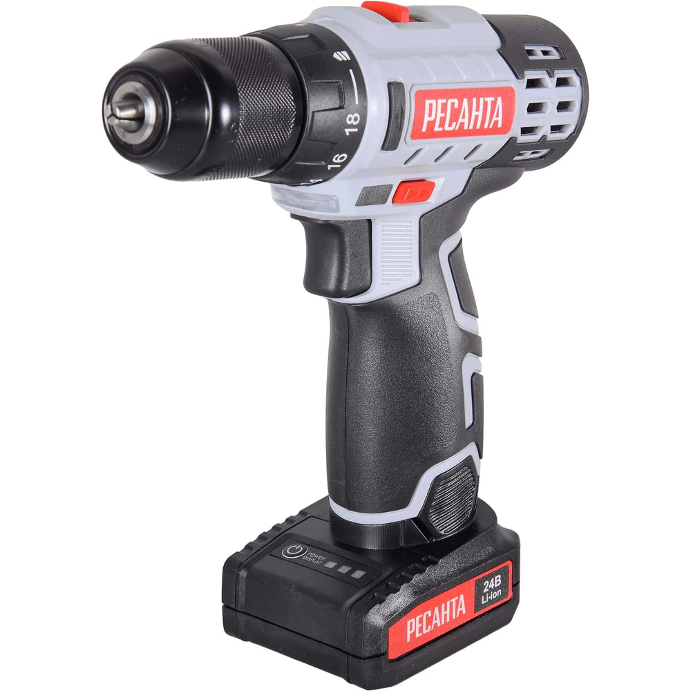 Дрель-шуруповерт аккумуляторного типа Ресанта ДА-24-2ЛК используется для сверления отверстий и монтажа крепежных элементов. Не требующий подключения к сети, инструмент может применяться при отсутствии электропитания. Наличие в комплекте двух литий-ионных аккумуляторов емкостью 2 А*ч с напряжением 24 В обеспечивает длительность непрерывной работы. Время зарядки составляет 1 час. Щеточный двигатель гарантирует высокую производительность. Система электронной защиты от перегрузок увеличивает срок службы инструмента.Возможность настройки вращающего момента с показателями 30 или 60 Н·м позволяет создавать отверстия в дереве до 30 мм, в металле - до 12 мм. Для удобства откручивания крепежей предусмотрена функция реверса. Наличие двух скоростных режимов работы 0-400 и 0-1400 об/мин позволяет настроить инструмент в зависимости от толщины материала. Быстрозажимной патрон устройства имеет диаметр 0,8-10 мм. Функция блокировки шпинделя обеспечивает быструю и удобную замену оснастки.Дрель-шуруповерт Ресанта ДА-24-2ЛК - мощная модель, имеет пистолетную конструкцию, подходит для любых задач, в т.ч. на стройплощадке. В сочетании с прорезиненной рукояткой это повышает удобство использования. Подсветка рабочей зоны обеспечивает точность выполняемых работ при недостаточном освещении. Компактные размеры и малый вес 1,35 кг не требуют значительных усилий в работе. Надежный пластиковый кейс предусматривает безопасность хранения и транспортировки.