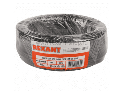 Кабель UTP 4PR 24AWG CAT5e 25м OUTDOOR REXANT. Неэкранированная витая пара, материал проводника высокоочищенная бескислородная медь, калибр (24 AWG).. Материал оболочки – ПЭ (PE).ОБЛАСТЬ ПРИМЕНЕНИЯ КАБЕЛЯ: