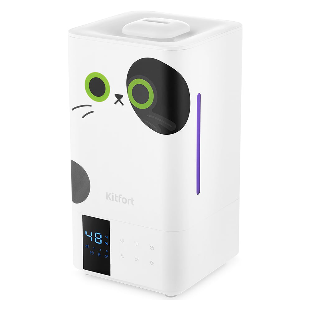 Ультразвуковой увлажнитель воздуха KT-2885 увлажняет воздух в помещении, создавая хороший микроклимат для проживания людей. Модель проста в эксплуатации, отличается высокой надёжностью в работе. Может использоваться в помещениях площадью до 50 м². В комплекте с увлажнителем идёт набор наклеек для создания образа милого котика. Каждая деталь пронумерована для соблюдения последовательности нанесения. В любой момент их можно отклеить - наклейки не оставляют следов на поверхности. Управлять устройством можно с помощью сенсорных кнопок на основании увлажнителя или с помощью пульта ДУ. На дисплее отображаются текущая влажность в помещении, а также время таймера и заданная влажность. Увлажнитель оснащен ультрафиолетовой лампой с длиной волны 270-285 нм для обеззараживания воды. Она имеет высокую обеззараживающую эффективность по отношению к бактериям и вирусам. Резервуар для воды съёмный, поэтому его удобно наполнять водой.