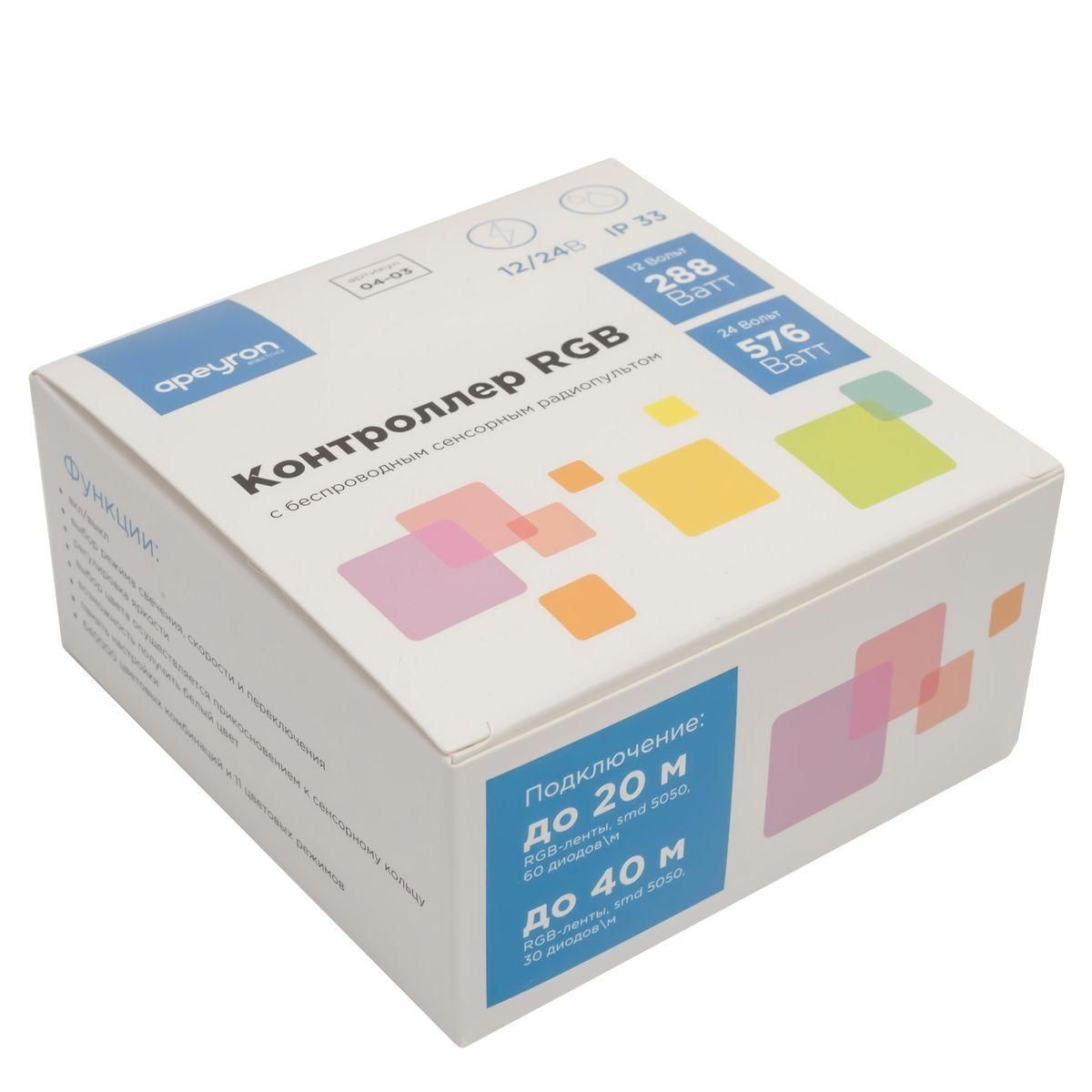 Расширенная гарантия на товар составляет 2 года. поставщик рекомендует использовать лампы накаливания с цоколем не указан для освещения площади не указана м2. Контроллер RGB Apeyron с пультом 12/24V 04-03(288) в современном стиле используется в интерьере не указан с установкой не указано.