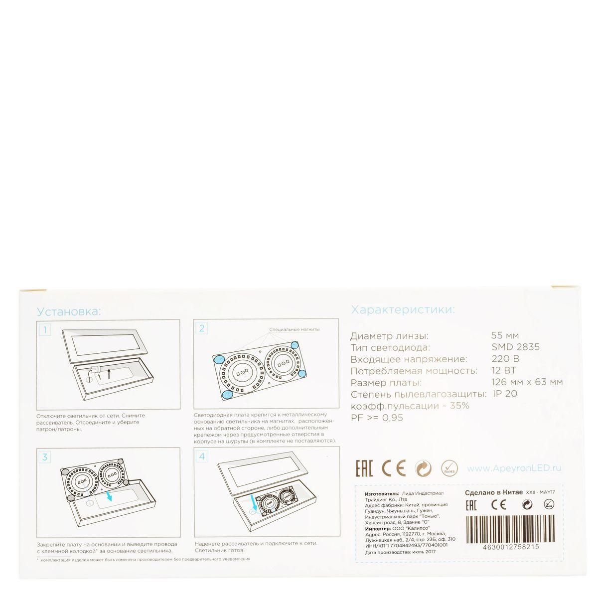 Расширенная гарантия на товар составляет 12 месяцев. поставщик рекомендует использовать лампы накаливания с цоколем не указан для освещения площади не указана м2. Светодиодный модуль Apeyron 02-21 в современном стиле используется в интерьере не указан с установкой не указано.