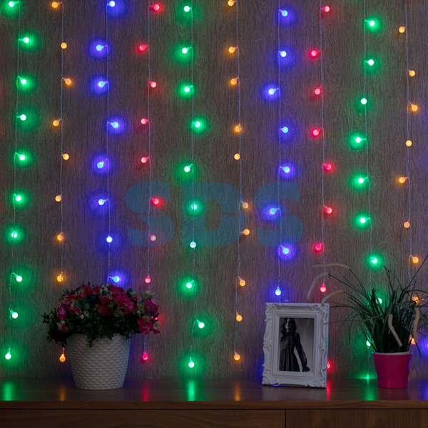 Гирлянда Светодиодный Дождь размером 1.5х1.5 метра с насадками в виде шариков, которые светятся с динамикой LED мультиколор. Подходит для использования в помещениях или на улице. Подключается к сети напряжением 230В. Позволяет создать атмосферу праздника и уюта в любом помещении или на улице.