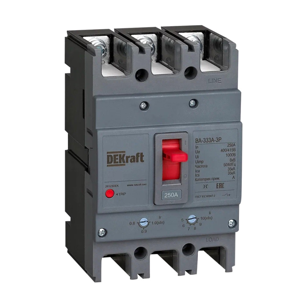 Продукт '28123DEK Силовой авт. выкл. 3P 250A 35кА ВА-333А' обладает трехполюсной конструкцией, что позволяет использовать его для трехфазных систем электроснабжения. Он предназначен для монтажа на DIN-рейку и обладает компактными размерами, что облегчает его установку и эксплуатацию.