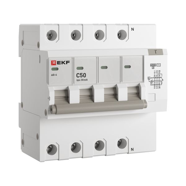 Дифференциальный автомат EKF АД-4 50А 30мА хар-ка C, AC, 270В 6кА PROxima DA4-6-50-30-pro представляет собой аппарат, сочетающий функции автоматического выключателя с устройством защитного отключения. При обнаружении автоматическим выключателем в защищаемом участке сети тока утечки (повреждения) на землю или сверхтока (тока перегрузки или короткого замыкания) происходит срабатывание устройства, приводящее к отключению защищаемой сети.