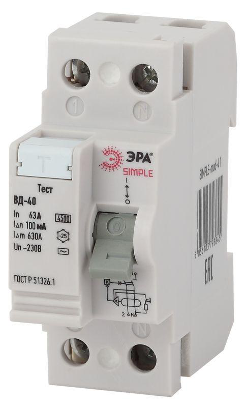 Устройство защитного отключения ЭРА SIMPLE УЗО ВД-40 2P 63А/100мА электронное Б0039268